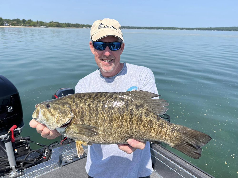 With water clarity ranging from 20 feet on many of the inland lakes, to over 40 feet at times on the Grand Traverse Bays, MI smallmouth bass fishing around the Traverse City area in northern Michigan is a special treat. Early May through October is when we can best target our northern Michigan bass. Come spend a day with us chasing smallies on the shallow sandy flats, or sight casting at cruising smallmouth bass in water as deep as 30 feet or more during the summer.